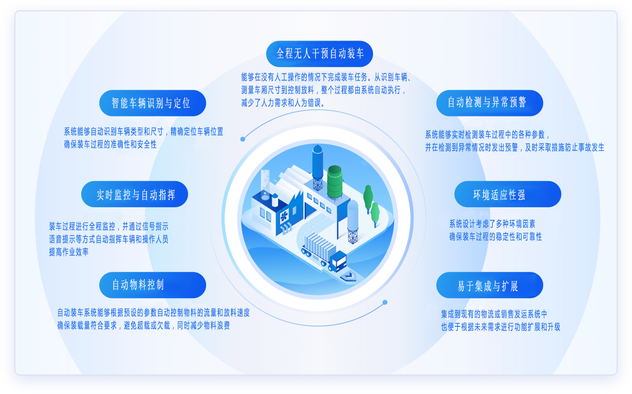 打造無(wú)人值守智慧裝車(chē)場(chǎng),助力運(yùn)營(yíng)實(shí)現(xiàn)降本、提質(zhì)、增收。通過(guò)精準(zhǔn)控制裝載量,優(yōu)化裝車(chē)流程,提升作業(yè)效率,確保物料裝載的準(zhǔn)確性和安全性,為物料裝載管理方帶來(lái)智能化、自動(dòng)化的全新體驗(yàn)。